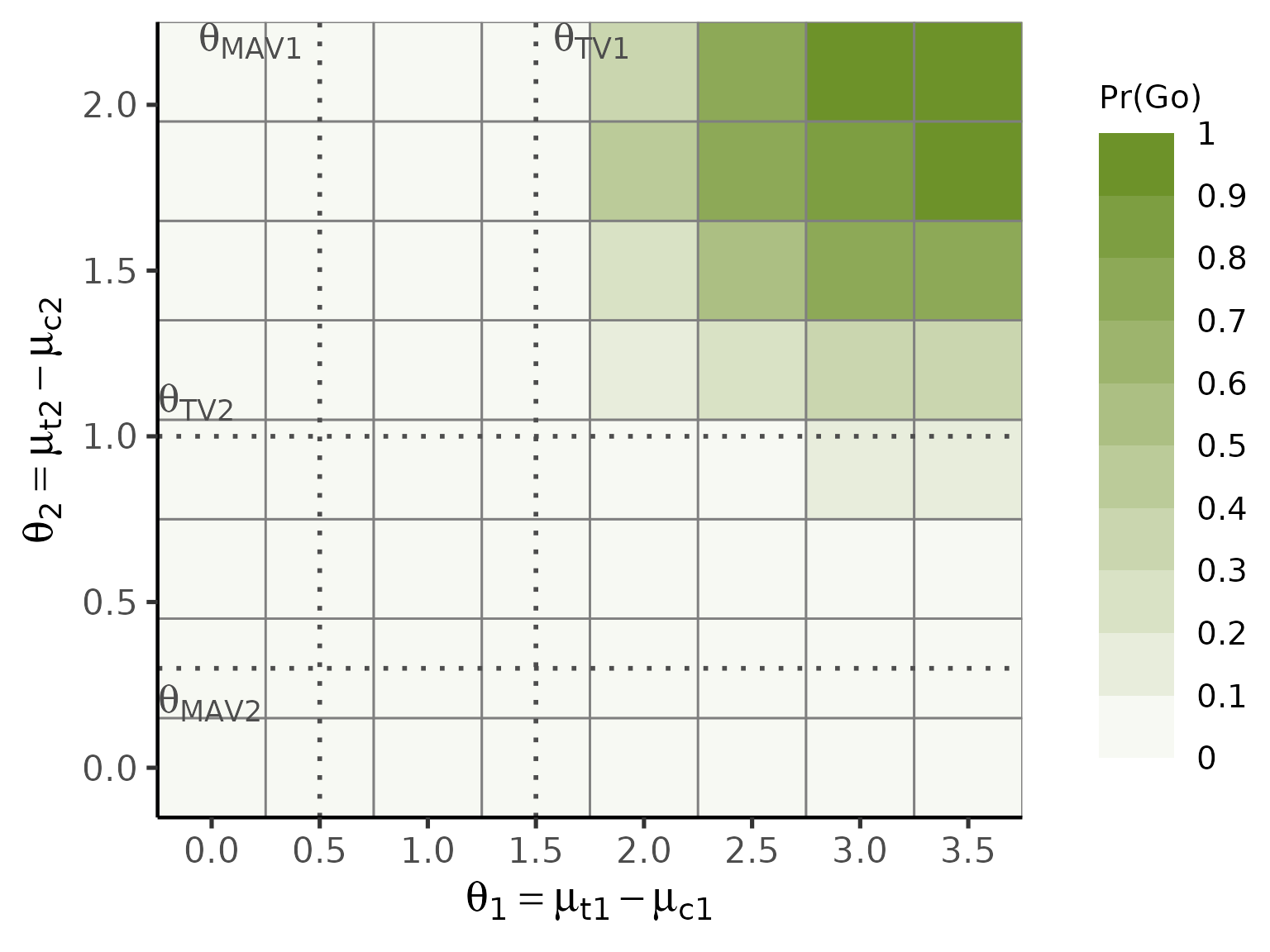 Go-calibration scenario: , (effect at MAV boundary – above which Go is not yet warranted, so is required). NoGo-calibration scenario: , (effect between MAV and TV – above which NoGo should be unlikely).