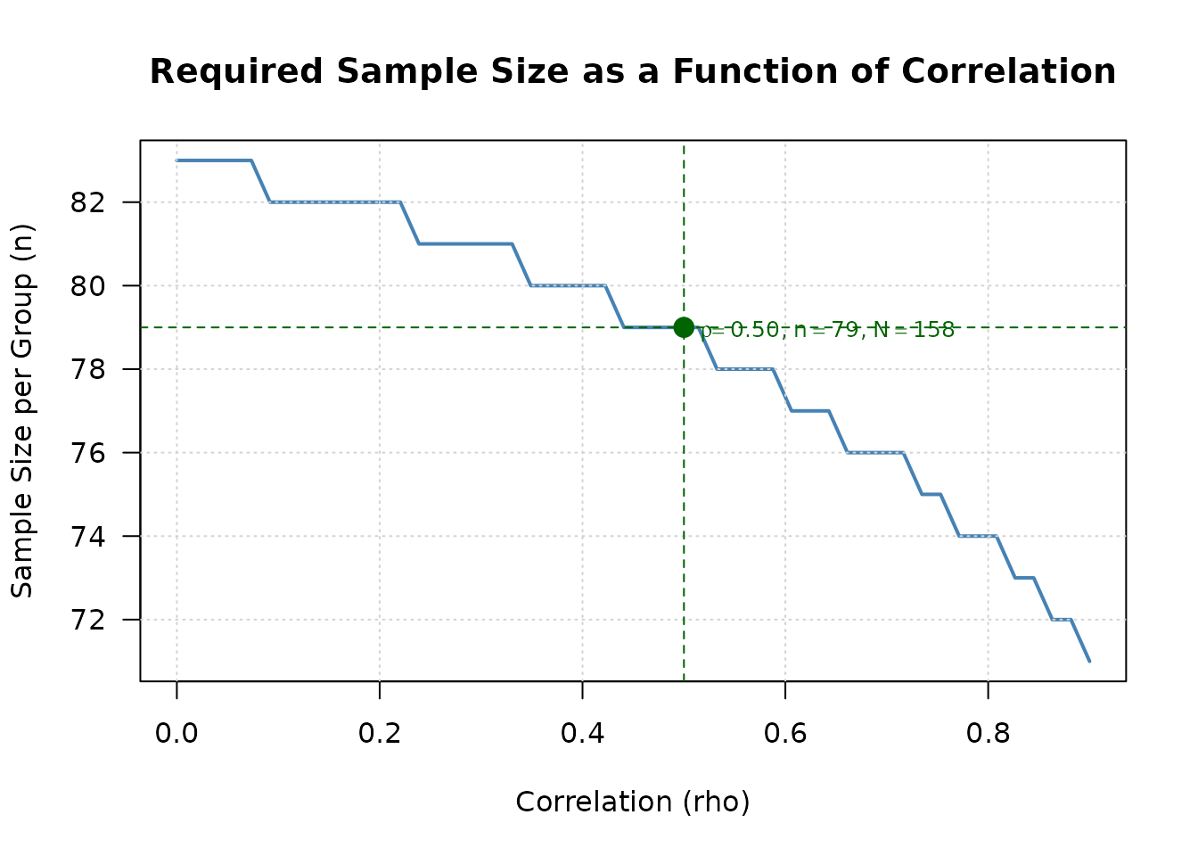 caption = "Sample Size vs Correlation (delta = 0.5, alpha = 0.025, power = 0.8)",